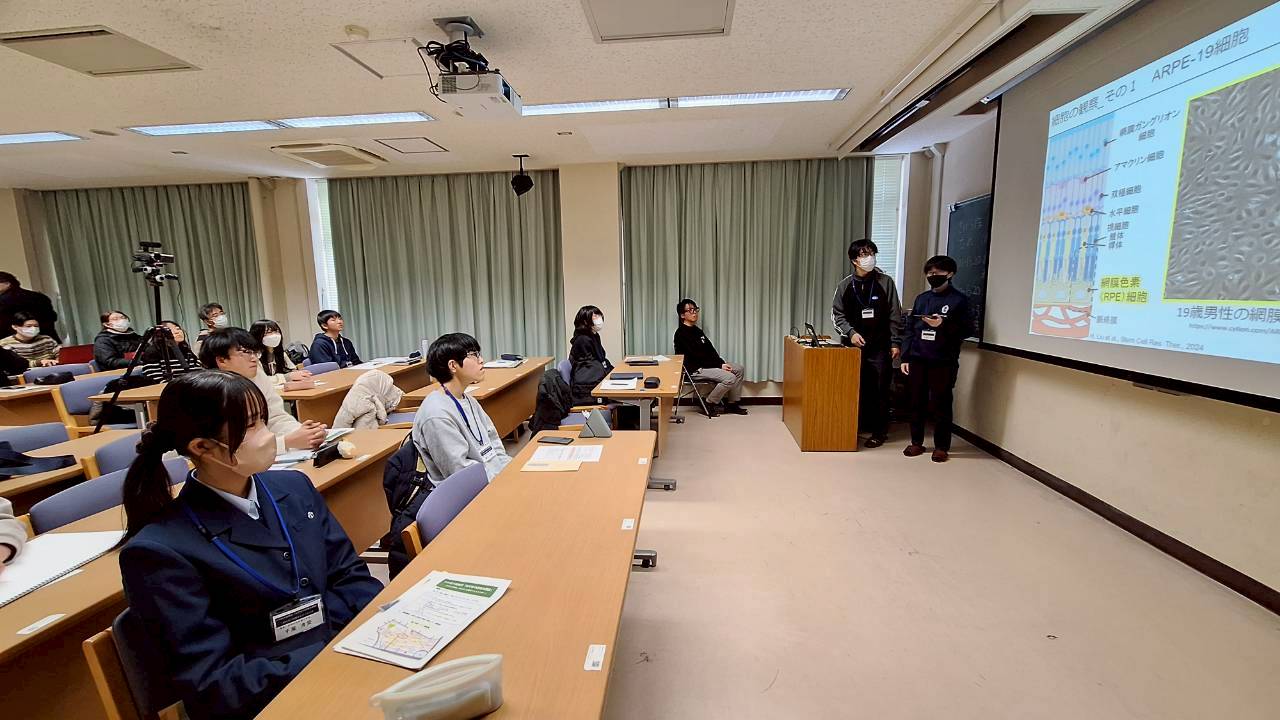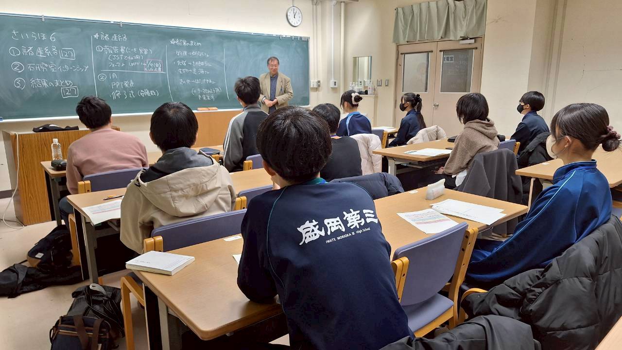 1/26(日)に第7回目の小中高大連携型「科学者の卵養成講座」(岩手大学実施;がんだい日曜サイエンスラボ)」を実施しました。中学生11名、高校生7名の参加がありました。今回は、最終回としてこれまで学んできたことを、物理、化学、生物、地学、数学・情報、科学一般の6つの班にわけて、実験・実習の成果や講義についての発表が行われました。いずれのテーマでも、実施内容や調べたことなどをスライドや動画にまとめて、わかりやすく、聞く人を楽しませる発表でした。生徒さんのご家族の方や高校の先生方も参加いただき、いい発表会になりました。また、東北大学の科学者の卵養成講座の代表として、渡辺先生からも受講生へ講評や挨拶をいただき、その後受講生の修了証の授与式も行いました。今年度はこれで終了となります。なお、次年度は4月下旬からの受講生募集を予定しています。