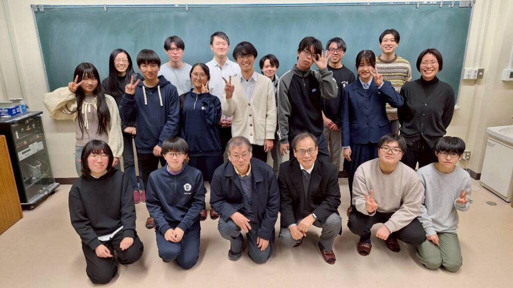 12/8(日)に第6回目の小中高大連携型「科学者の卵養成講座」(岩手大学実施;がんだい日曜サイエンスラボ)」を実施しました。中学生11名、高校生9名の参加がありました。今回は、これまでの講義形式と異なり、6つの大学の研究室に分かれて、実験や実習を中心に実施しました。物理分野は「宇宙から降り注ぐ粒子をつかまえてみよう~シンチレータの製作と宇宙線ミューオン測定~」のテーマで、メンターの渡邊夏七子さん、細川律也先生(岩手大学 理工学部 数理・物理コース)にアレンジいただき、2名の生徒さんが参加しました。化学分野は「プラスチックの生合成と化学合成の違いについて、見学・体験を通して考えてみよう」のテーマで、山田美和先生(岩手大学 農学部 応用生物化学科)にアレンジいただき、4名の生徒さんが参加しました。生物分野は「振動を用いた昆虫の行動解析実験」のテーマで、高梨琢磨先生(森林研究・整備機構森林総合研究所)、佐原健先生(岩手大学 農学部 植物生命科学科)にアレンジいただき、5名の生徒さんが参加しました。地学分野は、「“シャボン半球”と“アメフラシ”の室内実験と高・低気圧の流体実験」のテーマで、名越利幸先生(岩手大学 名誉教授)にアレンジいただき、3名の生徒さんが参加しました。数学・情報分野は、「画像を認識する人工知能を実際に作り,性能を確かめよう」のテーマで、木村彰男先生(岩手大学 理工学部 知能・メディア情報コース)にアレンジいただき、2名の生徒さんが参加しました。科学・工学一般では、「静電気とその利用~イオンエンジン:知る・見る・使う~」のテーマで高木浩一(岩手大学 理工学部 電気電子通信コース)がアレンジして、4名の生徒さんが参加しました。いずれのテーマでも、生徒さんは先生やチュータの学生さんに質問しながら、熱心に取り組んでいました。実習の様子は、次回(1/26)、それぞれの班より発表してもらうようにしています。