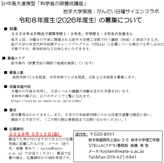 がんだい日曜サイエンスラボ(通称:さいらぼ)は、科学好きな中高校生の皆さんが岩手大学理工学部に毎月1回集まって、科学に関する講座を共に受講し、皆で語らい、時には実験をしながら、科学の楽しさを更に体感してもらうことを目的としています。